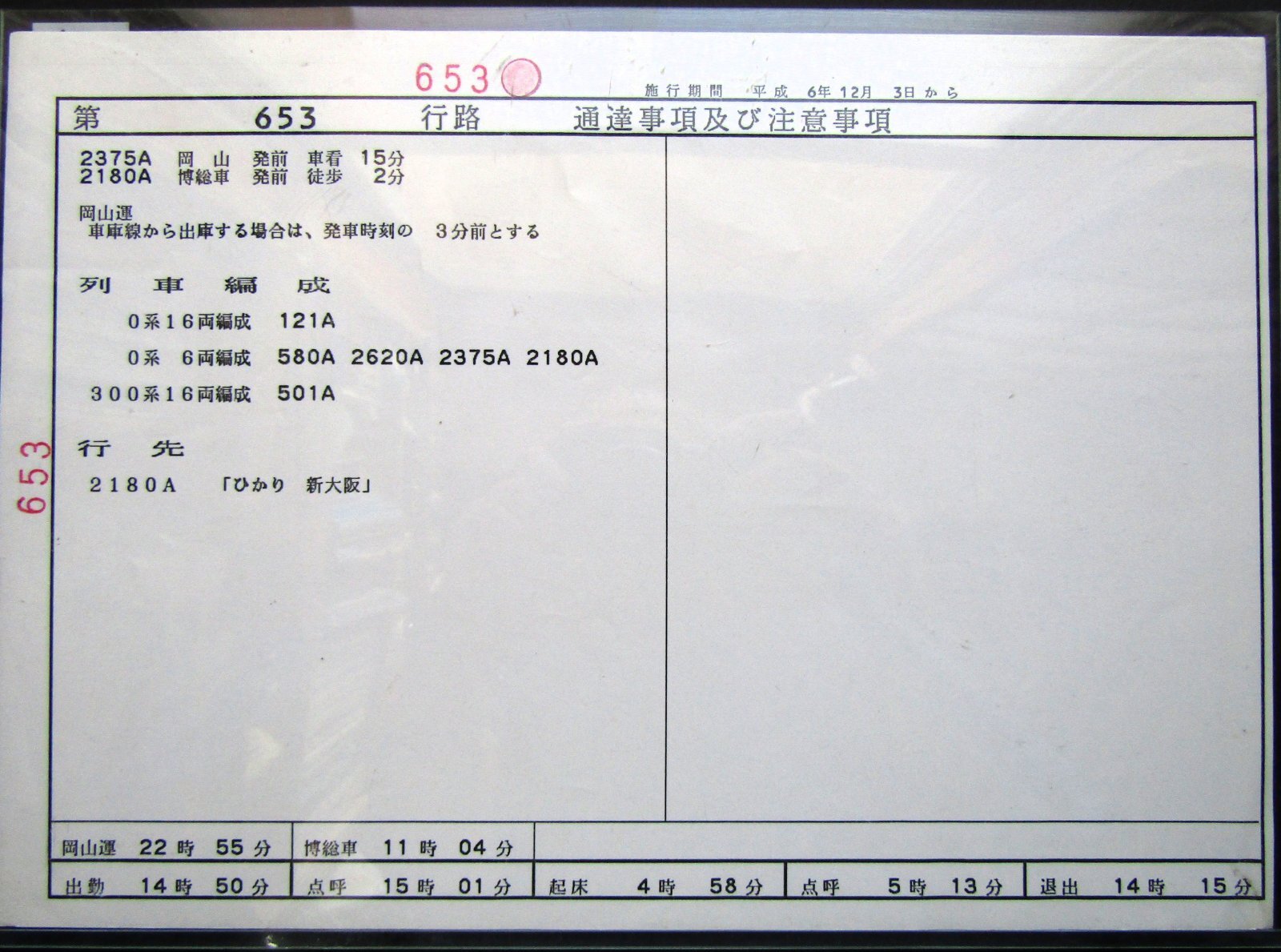 山陽新幹線 運転士時刻表 第 653 行 路 広幹運乗派 施行期間;平成6年12月3日から