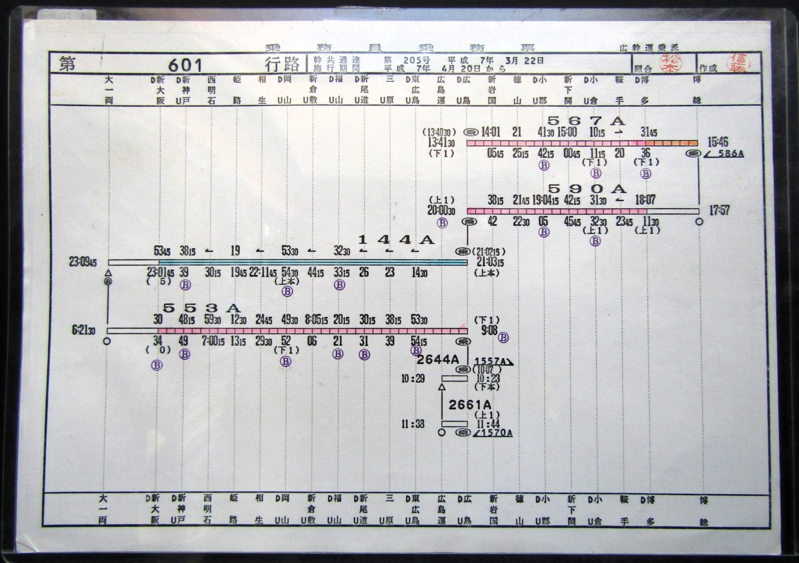 山陽新幹線 運転士時刻表 第 601 行 路 広幹運乗派 施行期間;平成7年4月20日から