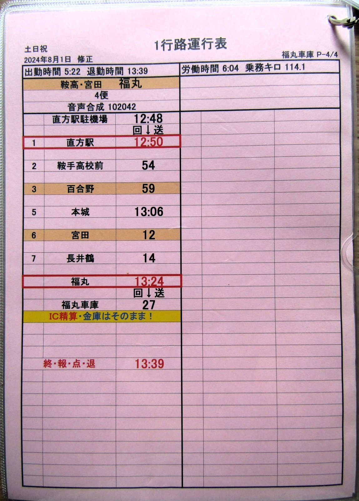 直方駅〜鞍手高校前〜百合野〜宮田〜福丸〜(回送)〜福丸車庫