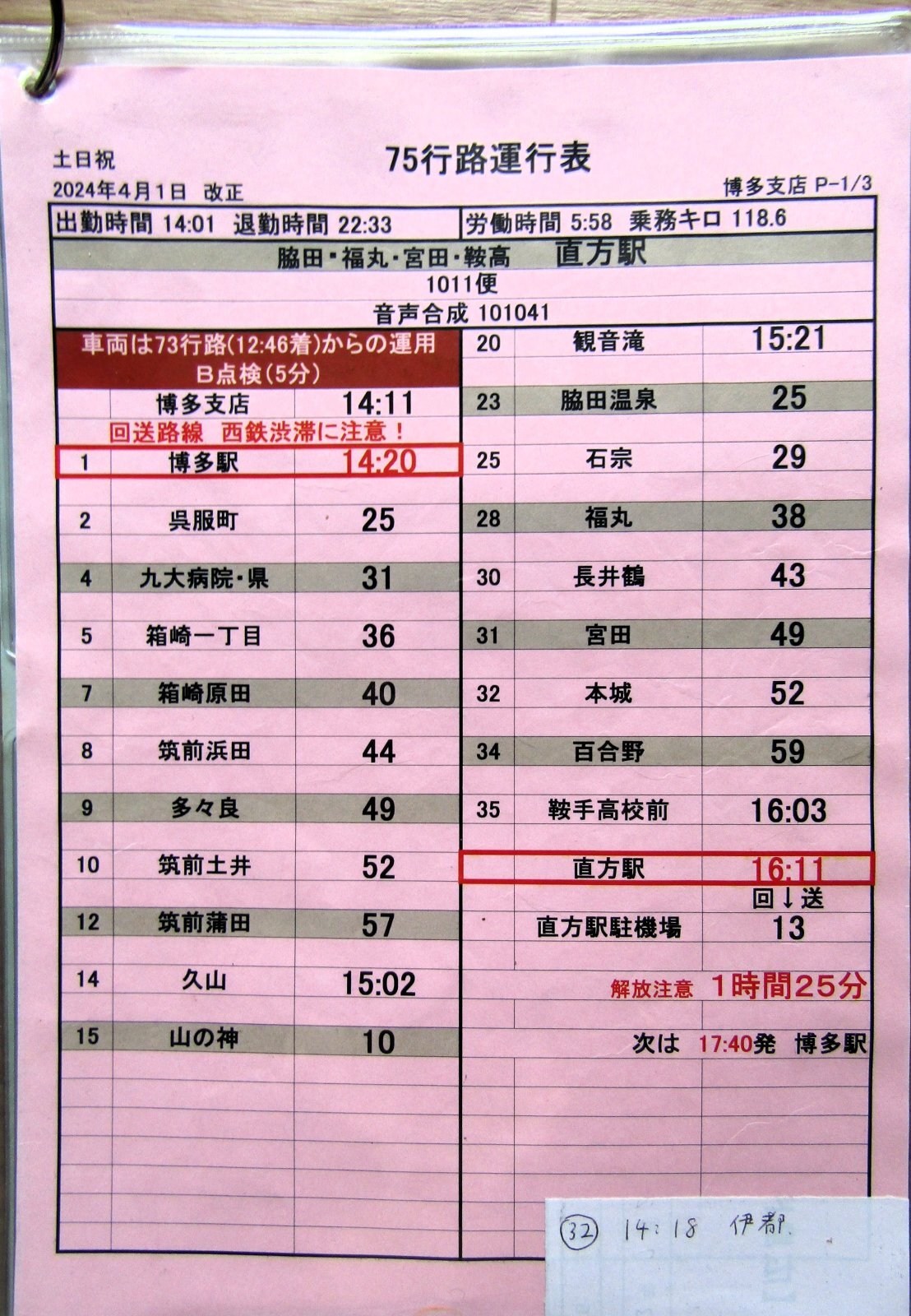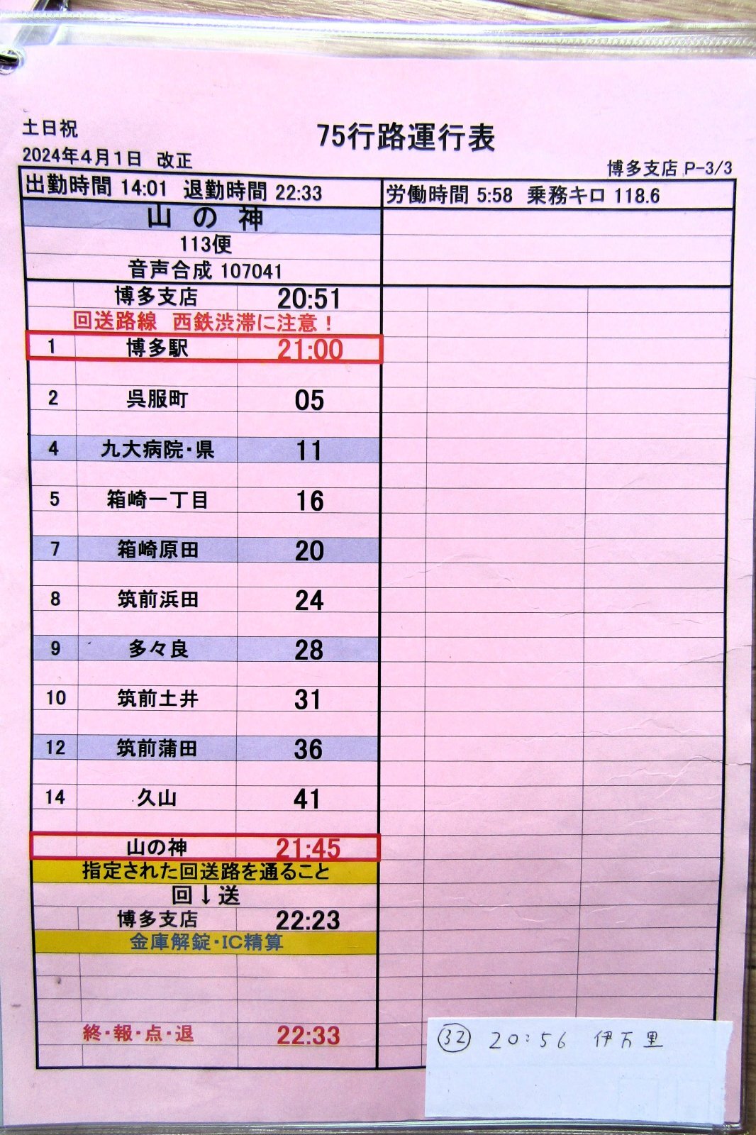 博多支店〜(回送)〜博多駅〜救済病院・県〜箱崎原田〜多々良〜筑前蒲田〜山の神〜脇田温泉〜