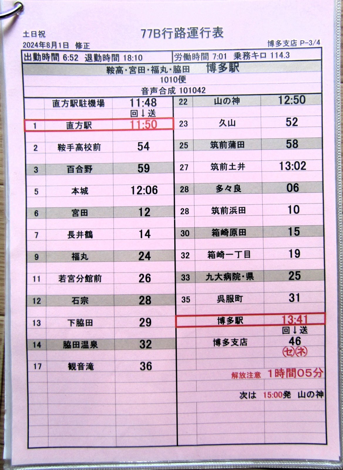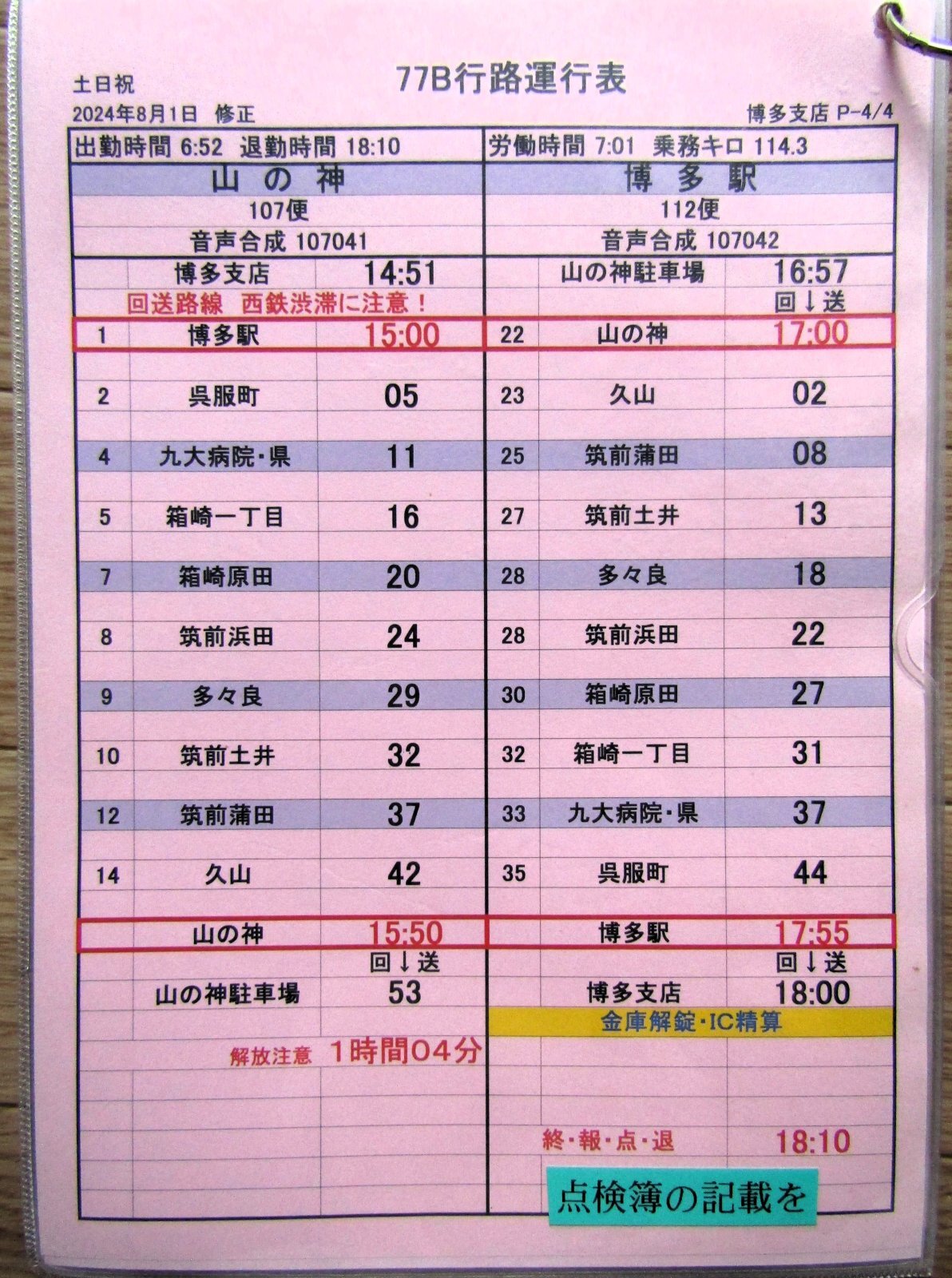 博多支店〜(回送)〜博多駅〜九大病院・県〜箱崎原田〜多々良〜筑前蒲田〜山の神 〜回送〜