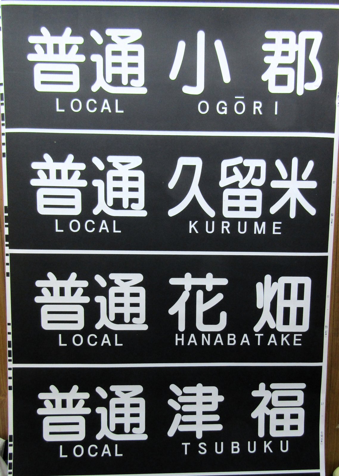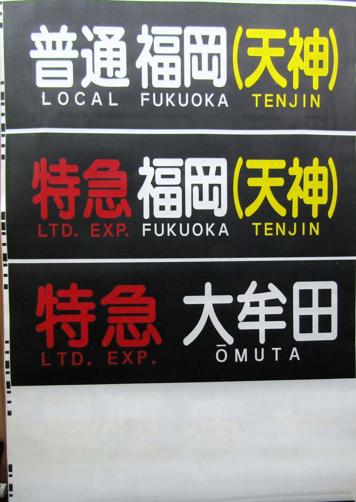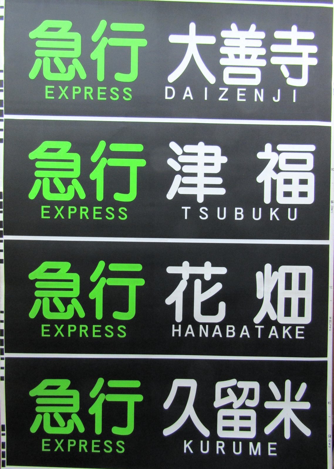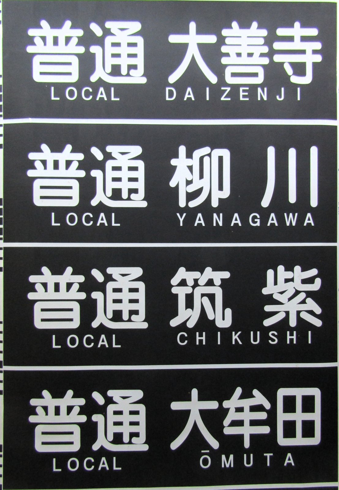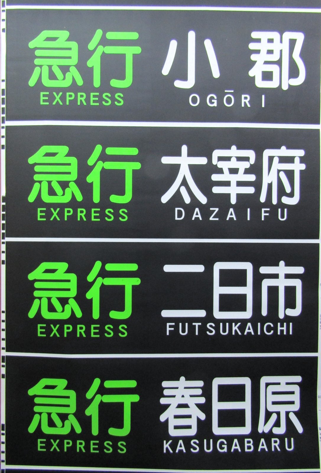 1)団体 2)回送 3)試運転 4)空白 5)普通 大橋 6)普通 春日原 7)普通 二日市 8)普通 大宰府 9)普通 小郡 10)普通 久留米 11)普通 花畑 12)普通 津福 13)普通 大善寺 14)普通 柳川 15)普通 筑紫 16)普通 大牟田 17)普通 福岡(天神)18)特急 福岡(天神) 19)特急 大牟田 20)空白 21)急行 福岡(天神) 22)急行 大牟田 23)急行 筑紫 24)急行 柳川 25)急行 大善寺 26)急行 津福 27)急行 花畑 28)急行 久留米 29)急行 小郡 30)急行 大宰府 31)急行 二日市 32)急行 春日原 33)急行 大橋 34)空白 35)空白 36)直行 二日市 37)空白 38)快急 福岡(天神) 39)空白 40)教習車 以下空白