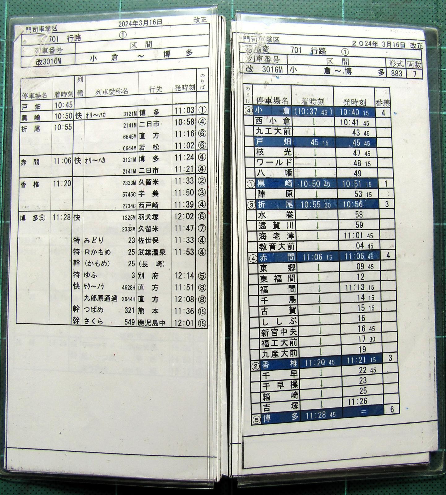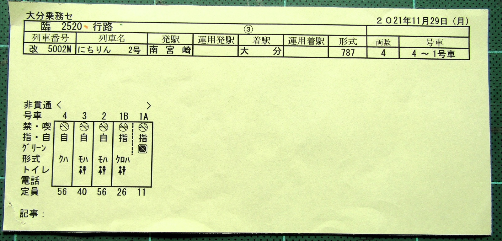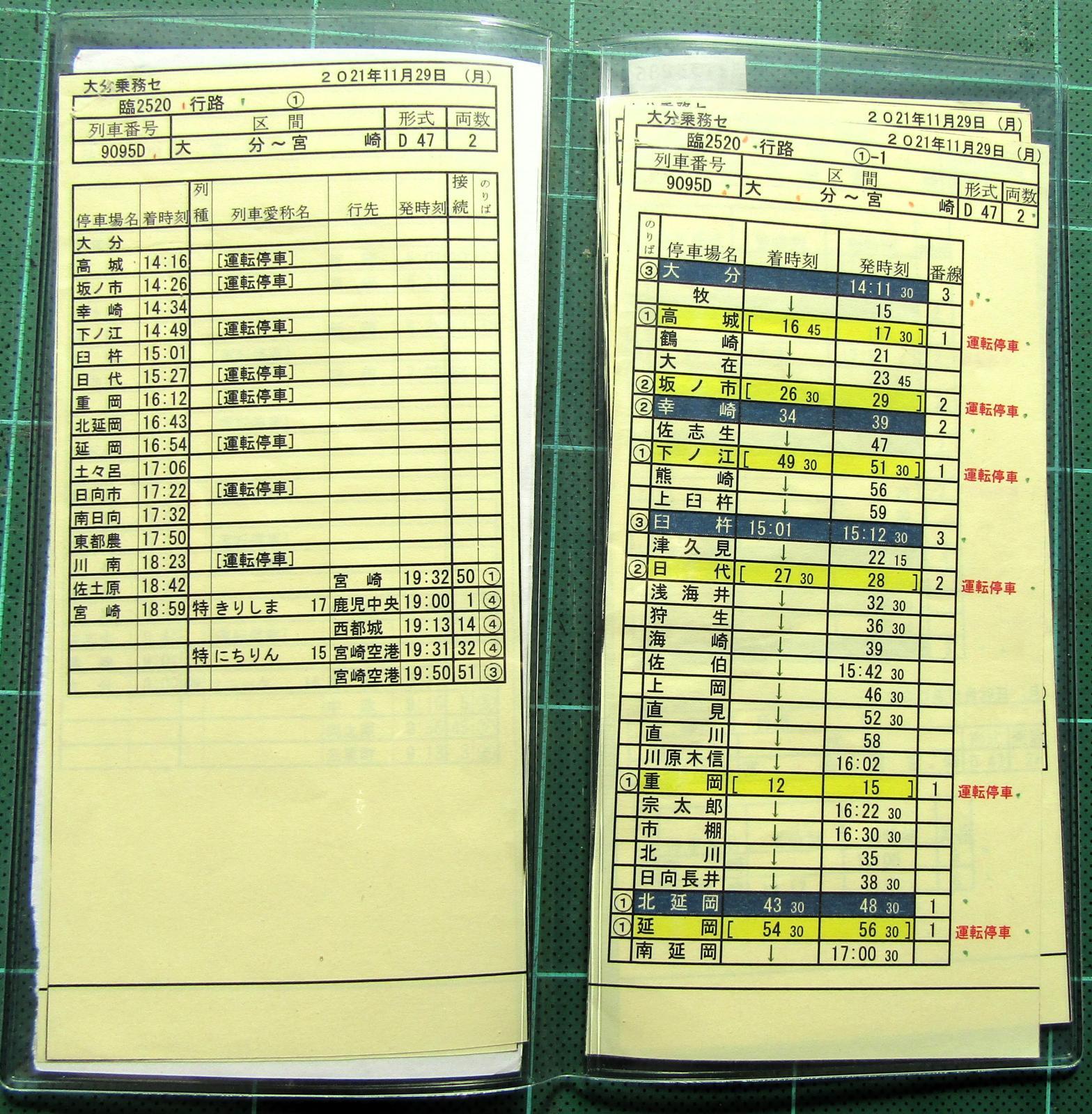 JR九州車掌携行時刻表セット 大分乗務センター 現場変 2520行路(特急 にちりん 担当)、施行日;2021年11月29日