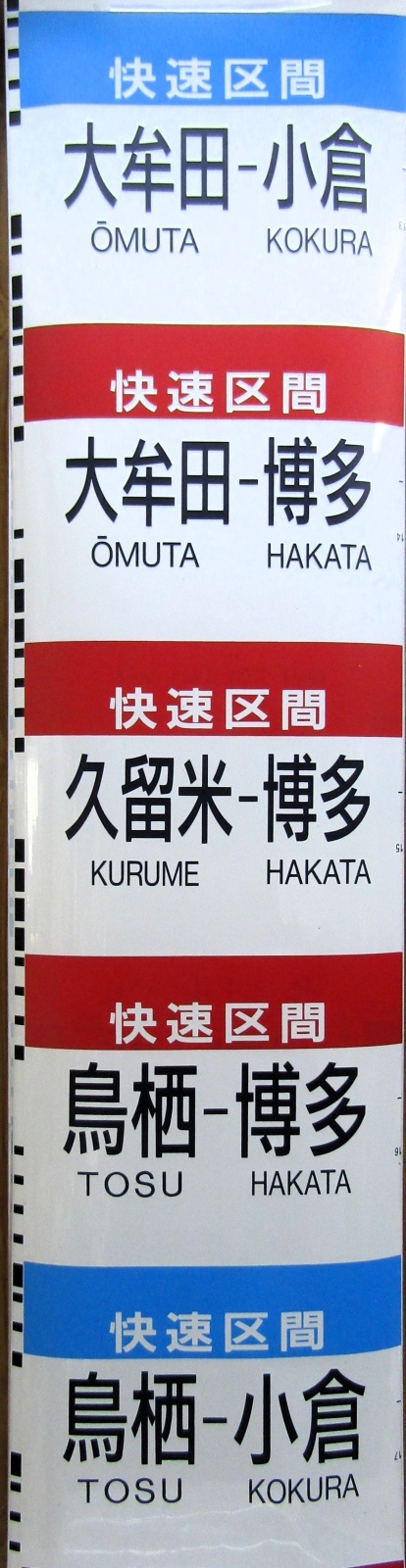 1,空白 2,黒色 3,普通 4,快速 5,急行 8,ワンマン 9,快速・ワンマン 10,JR 11,815 12,快速区間 博多ー小倉 13,快速区間 久留米ー小倉 14,快速区間 大牟田ー小倉 15,快速区間 大牟田ー博多 16,快速区間 久留米ー博多 17,快速区間 鳥栖ー博多 18,快速区間 鳥栖ー小倉 19,快速区間 二日市ー博多 20,快速区間 二日市ー小倉 21,ワンマン 22,快速・ワンマン 23,ワンマン快速区間 熊本〜大牟田 24,ワンマン快速区間 熊本〜光の森 25.ワンマン快速区間 熊本〜肥後大津 以下空白
